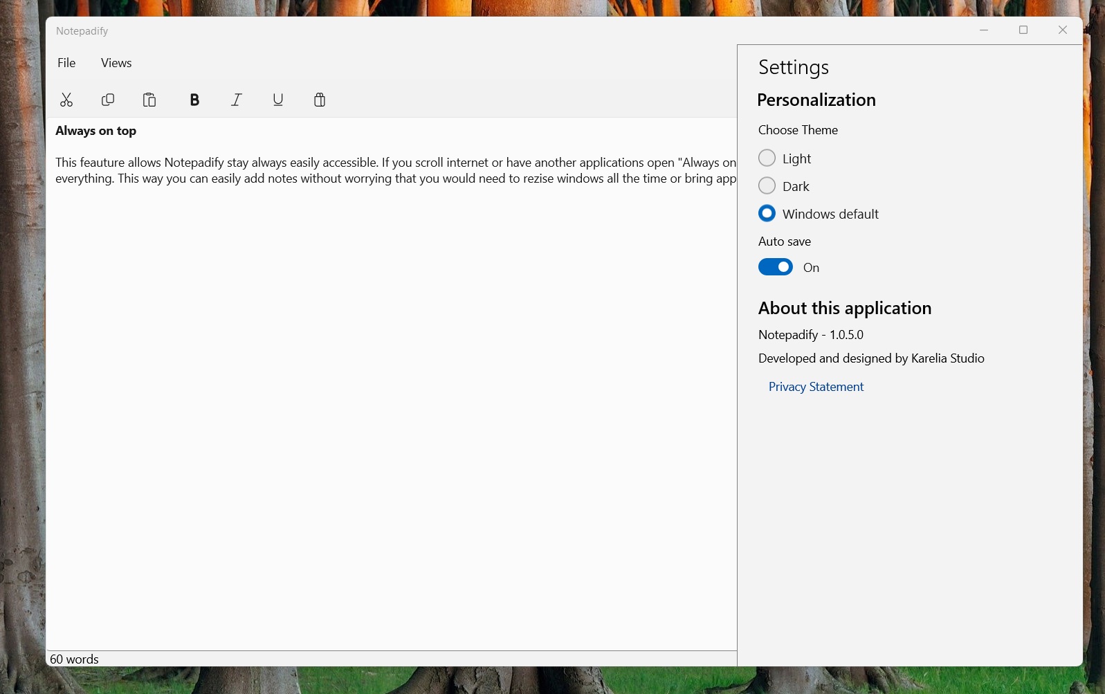 Notepadify has built in optional auto save feature. This is one example where Notepadify differences from Microsoft Notepad. auto save file work after you have saved file once yourself or if you are editing already existing file. It will save every 1 min if there has been more than few character change. This is optional feature so it can be disabled from settings.
